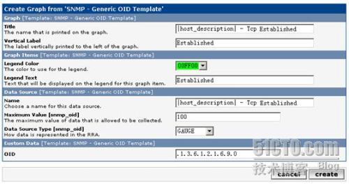 填写以下信息,在“Title”文本框中填写Graph的名字,在“Vertical Lable”文本框中填写描述信息或是所绘图片使用的单位等,显示在所绘图片的左侧,在“name”文本框中填写此数据源的名字,在“LegendColor”中选择画图使用的颜色,在“Legend Text”填写图例的名字,在“OID”文本框中填写要监控的主机的OID信息,点击“create”按钮完成Graph的创建。