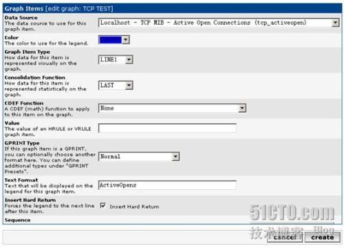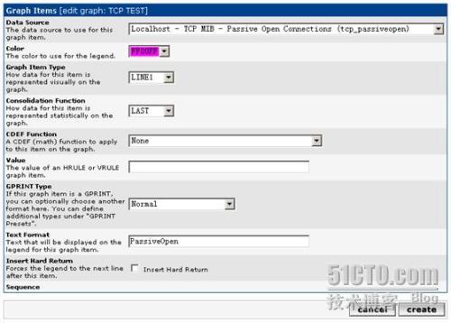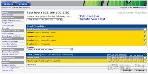 点击“Create”创建选择的监测内容,已经选择创建的内容会自动变成灰色并且不能再点选。Cacti会自动创建该监测点的rrd文件(在rra文件夹中)、“Data Source”和“graph”条目。
