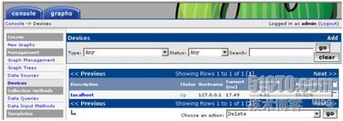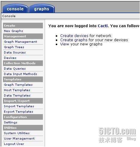 登陆Cacti后,可以看到左上角是两个选项卡,“console”和“graphs”。console表示控制台,在此进行所有的配置等操作;而graphs则是用来查看所有服务器的性能图像的界面。