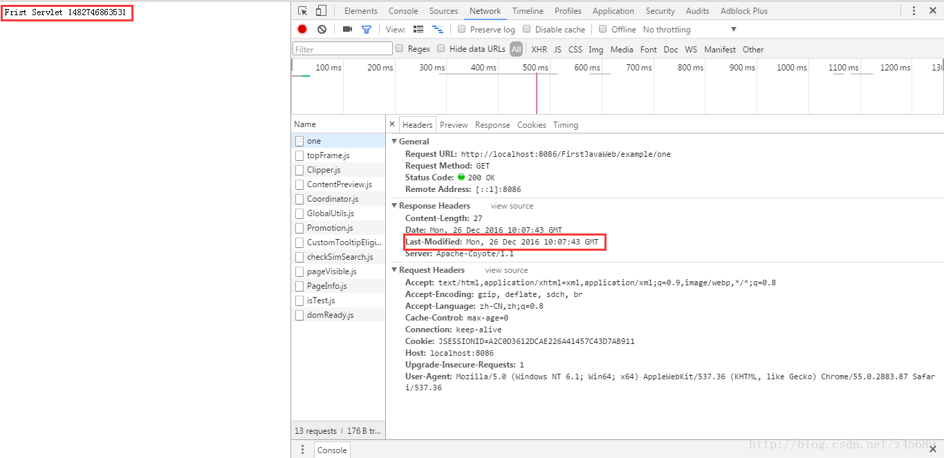 解注释第一个重写的getLastModified方法并运行,这个getLastModified方法每次返回一个新的时间值,并且总是大于请求头”If-Modified-Since”的时间值。这次我们看到响应头中多了“Last-Modified”字段,刷新下浏览器,此时请求头中多了”If-Modified-Since”,并且响应头中依然包含“Last-Modified”头,响应状态码为200,浏览器窗口中显示的字符串的时间值也一直在随着时间推进。
