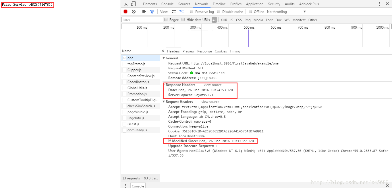 注释这个getLastModified方法,并解注释第二个重写的getLastModified方法,这个方法每次返回的值为请求头”If-Modified-Since”的值。刷新下浏览器,我们看到此时的响应头中并没有”Last-Modified”头,并且响应的状态码为304。再刷新下浏览器,我们看到浏览器窗口中显示的字符串中的时间值没变,证明了此时浏览器加载的是缓存的数据,并不是服务器端传回来的新数据。还有”If-Modified-Since”的时间值也没有改变。
