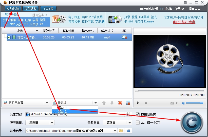 2,安装“狸窝全能视频转换器”,“添加视频”->“选择音轨2”-“转换”即可