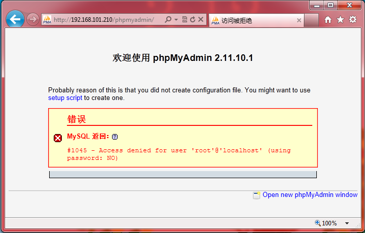 接下来:客户端测试显示如下结果:可以看出phpmyadmin管理php和mysql时出现如下问题: