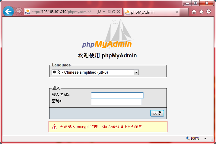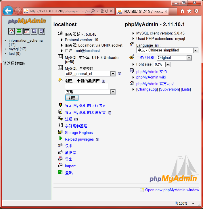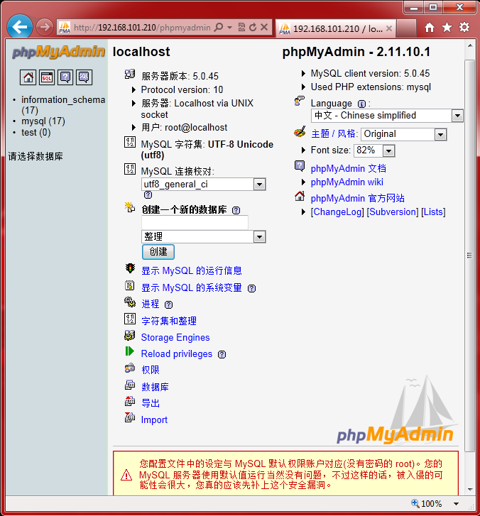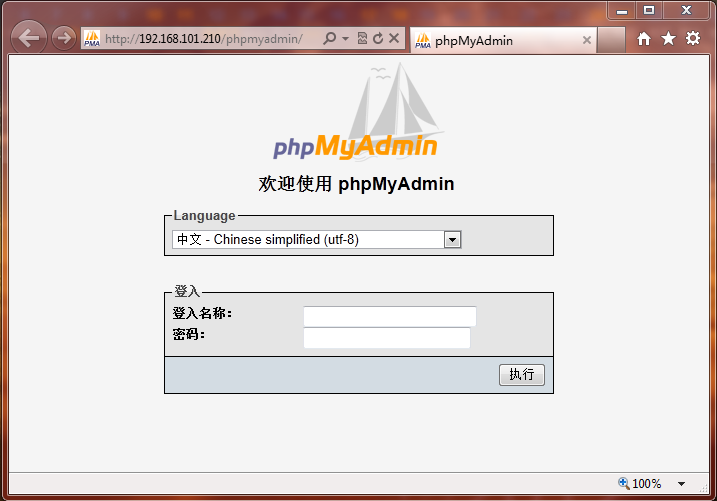 客户端测试输入192.168.101.210/phpmyadmin显示如下结果:可以看出phpmyadmin可以正常使用,正常管理php和mysql。