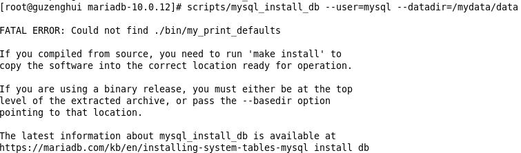 在/usr/local/mysql下使用scripts/mysql_install_db --user=mysql --datadir=/mydata/data 初始化mariadb