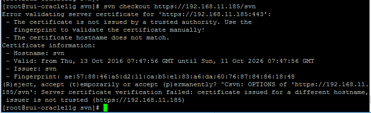 这时,再次使用svn co检出代码,发现它会问你:(R)eject, accept (t)emporarily or accept (p)ermanently?