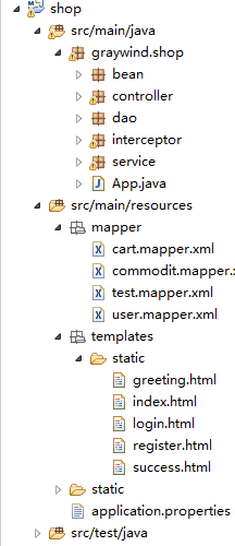 然后是MyBatis的集成。application.properties再添加设置如下,mybatis.mapperLocations是xml文件在recources目录下的路径