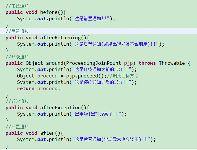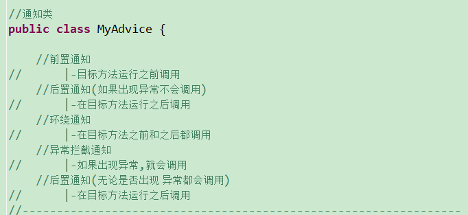 1 package cn.itcast.d_springaop; 2 3 import org.aspectj.lang.ProceedingJoinPoint; 4 5 //通知类 6 public class MyAdvice { 7 8 //前置通知 9 // |-目标方法运行之前调用 10 //后置通知(如果出现异常不会调用) 11 // |-在目标方法运行之后调用 12 //环绕通知 13 // |-在目标方法之前和之后都调用 14 //异常拦截通知 15 // |-如果出现异常,就会调用 16 //后置通知(无论是否出现 异常都会调用) 17 // |-在目标方法运行之后调用 18 //---------------------------------------------------------------- 19 //前置通知 20 public void before(){ 21 System.out.println("这是前置通知!!"); 22 } 23 //后置通知 24 public void afterReturning(){ 25 System.out.println("这是后置通知(如果出现异常不会调用)!!"); 26 } 27 //环绕通知 28 public Object around(ProceedingJoinPoint pjp) throws Throwable { 29 System.out.println("这是环绕通知之前的部分!!"); 30 Object proceed = pjp.proceed();//调用目标方法 31 System.out.println("这是环绕通知之后的部分!!"); 32 return proceed; 33 } 34 //异常通知 35 public void afterException(){ 36 System.out.println("出事啦!出现异常了!!"); 37 } 38 //后置通知 39 public void after(){ 40 System.out.println("这是后置通知(出现异常也会调用)!!"); 41 } 42 }