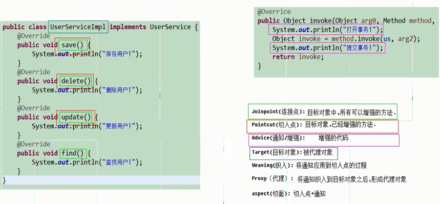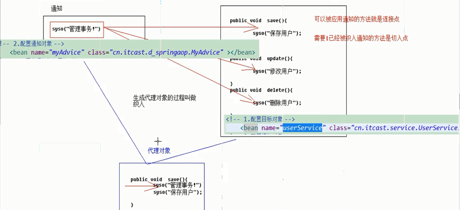 其中weaving,也可以说是:将通知应用到连接点形成切入点的过程,是一个动词,然后这个携带通知的切入点会切入到每个需要增强的连接点;