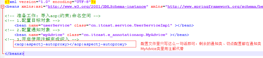 1 <?xml version="1.0" encoding="UTF-8"?> 2 <beans xmlns:xsi="http://www.w3.org/2001/XMLSchema-instance" 3 xmlns="http://www.springframework.org/schema/beans" 4 xmlns:context="http://www.springframework.org/schema/context" 5 xmlns:aop="http://www.springframework.org/schema/aop" 6 xsi:schemaLocation="http://www.springframework.org/schema/beans http://www.springframework.org/schema/beans/spring-beans-4.2.xsd http://www.springframework.org/schema/context http://www.springframework.org/schema/context/spring-context-4.2.xsd http://www.springframework.org/schema/aop http://www.springframework.org/schema/aop/spring-aop-4.2.xsd "> 7 8 <!-- 准备工作: 导入aop(约束)命名空间 --> 9 <!-- 1.配置目标对象 --> 10 <bean name="userService" class="cn.itcast.service.UserServiceImpl" ></bean> 11 <!-- 2.配置通知对象 --> 12 <bean name="myAdvice" class="cn.itcast.d_springaop.MyAdvice" ></bean> 13 <!-- 3.配置将通知织入目标对象 --> 14 <aop:config> 15 <!-- 配置切入点 以下是不断简化写法的过程: 16 public void cn.itcast.service.UserServiceImpl.save() 17 void cn.itcast.service.UserServiceImpl.save() 18 * cn.itcast.service.UserServiceImpl.save() 19 * cn.itcast.service.UserServiceImpl.*() 20 21 * cn.itcast.service.*ServiceImpl.*(..) 22 * cn.itcast.service..*ServiceImpl.*(..) 23 --> 24