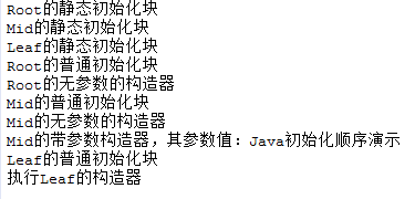 class Root { static{ System.out.println("Root的静态初始化块"); } { System.out.println("Root的普通初始化块"); } public Root() { System.out.println("Root的无参数的构造器"); } } class Mid extends Root { static{ System.out.println("Mid的静态初始化块"); } { System.out.println("Mid的普通初始化块"); } public Mid() { System.out.println("Mid的无参数的构造器"); } public Mid(String msg) { //通过this调用同一类中重载的构造器 this(); System.out.println("Mid的带参数构造器,其参数值:" + msg); } } class Leaf extends Mid { static{ System.out.println("Leaf的静态初始化块"); } { System.out.println("Leaf的普通初始化块"); } public Leaf() { //通过super调用父类中有一个字符串参数的构造器 super("Java初始化顺序演示"); System.out.println("执行Leaf的构造器"); } } public class TestStaticInitializeBlock { public static void main(String[] args) { new Leaf(); } }