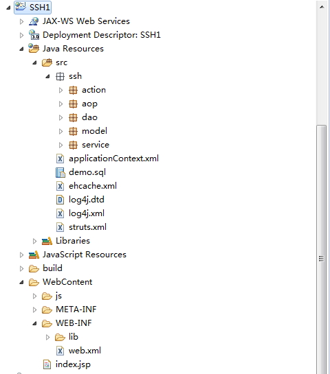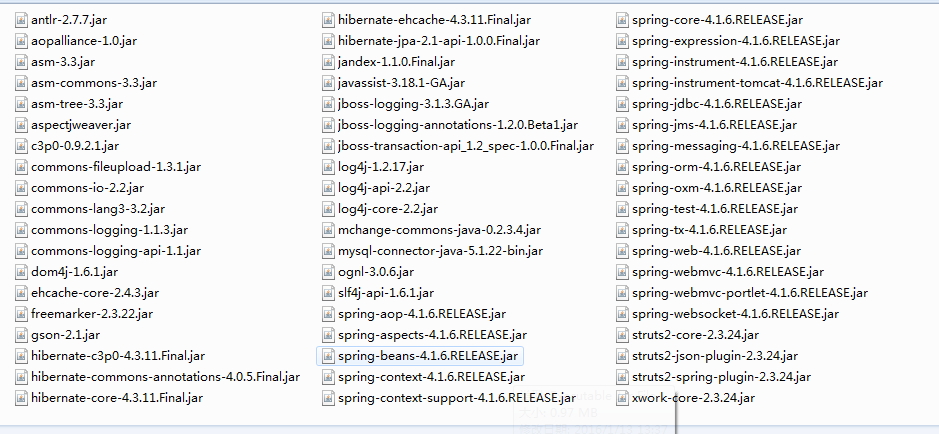 相关jar包都可以在下载下来的struts、spring、hibernate中找到,这里给个参考,有些是可以删除的,比如spring mvc部分的jar包:
