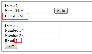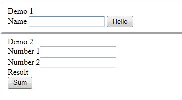 1 <body> 2 <fieldset> 3 <ledend>Demo 1</ledend> 4 <form> 5 Name <input type="text" id="fullname"> 6 <input type="button" value="Hello" id="bttHello"> 7 <br> 8 <span id="result1"></span> 9 </form> 10 </fieldset> 11 12 <fieldset> 13 <ledend>Demo 2</ledend> 14 <form> 15 Number 1<input type="text" id="number1"><br> 16 Number 2<input type="text" id="number2"><br> 17 Result<span id="result2"></span><br> 18 <input type="button" value="Sum" id="bttSum"> 19 20 21 </form> 22 </fieldset> 23 24 </body>