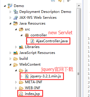1 <head> 2 <meta http-equiv="Content-Type" content="text/html; charset=ISO-8859-1"> 3 <title>Demo Ajax</title> 4 <script type="text/javascript" src="js/jquery-3.2.1.min.js"></script> 5 <script type="text/javascript"> 6 $(document).ready(function() { 7 $('#bttHello').click(function() { 8 var fullname = $('#fullname').val(); 9 $.ajax({ 10 type: 'POST', 11 data: { 12 fullname: fullname, 13 action:'demo1' 14 }, 15 url: 'AjaxController', 16 success: function(result) { 17 $('#result1').html(result); 18 } 19 }); 20 }); 21 22 $('#bttSum').click(function() { 23 var number1 = $('#number1').val(); 24 var number2 = $('#number2').val(); 25 $.ajax({ 26 type: 'POST', 27 data: { 28 number1:number1, 29 number2:number2, 30 action:'demo2' 31 }, 32 url: 'AjaxController', 33 success: function(result) { 34 $('#result2').html(result); 35 } 36 }); 37 }); 38 }); 39 40 </script> 41 </head>