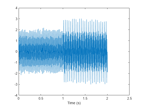 对于这个例子,考虑由具有明显频率变化的正弦波组成的非平稳连续信号。手提钻的振动或烟花声是非平稳连续信号的例子。