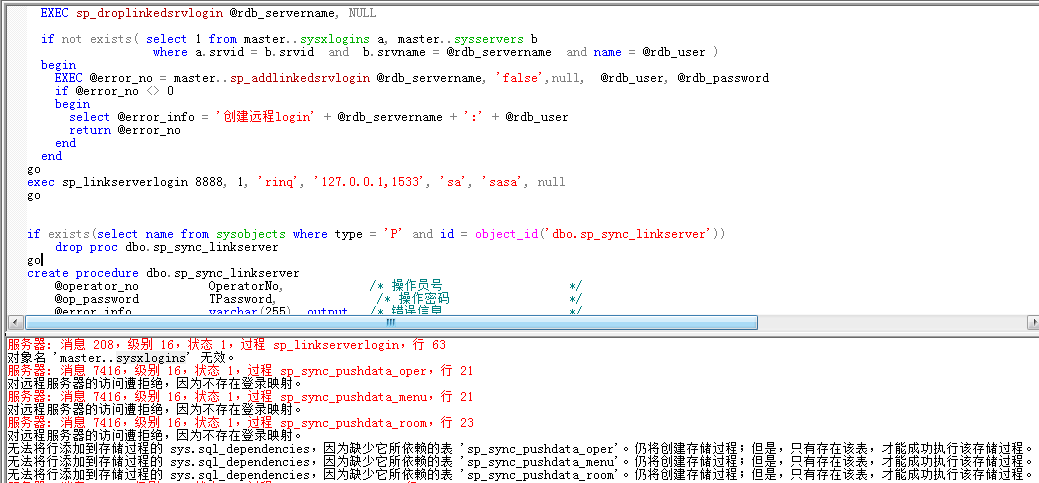 在sqlserver2005下执行下列存储过程报如下图所示的错误,有两个原因:"对象名 'master..sysxlogins' 无效。"是因为sqlserver2005中把master的sysxlogins表变为了视图syslogins,把该对象改为master..syslogins就可以了。下面不存在登录映射是因为截图中第一个if判断总是为假,导致master..sp_addlinkedsrvlogin这个存储过程一直没有执行,所以一直报错不存在登录映射。另外系统数据库在执行时可以直接调用不需要在前面再加上master..来限定。