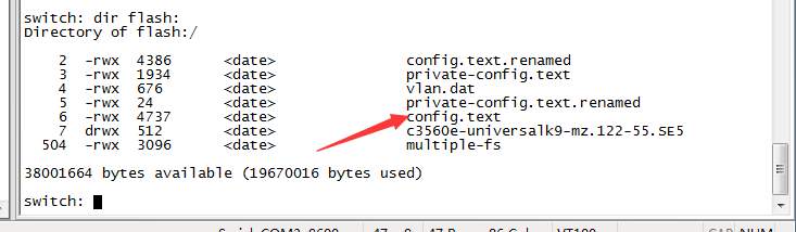 4、输入命令<dir flash:> 回车,查看交换机配置文件,