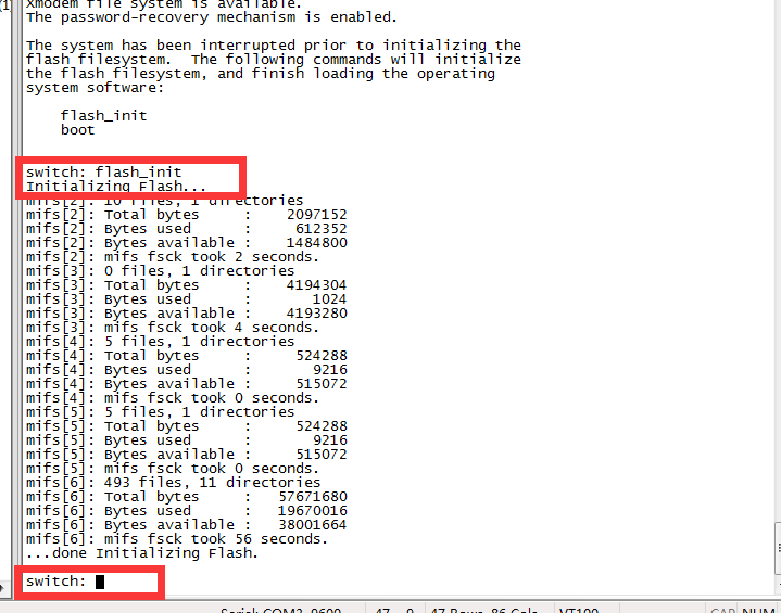 3、输入命令<flash_init > 回车,初始化flash文件系统。该模式下,不支持命令的缩写,一定要把命令写全。