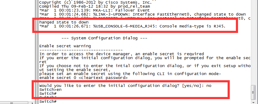 出现<*Mar 1 00:01:26.671: %USB_CONSOLE-6-MEDIA_RJ45: Console media-type is RJ45.>提示按回车