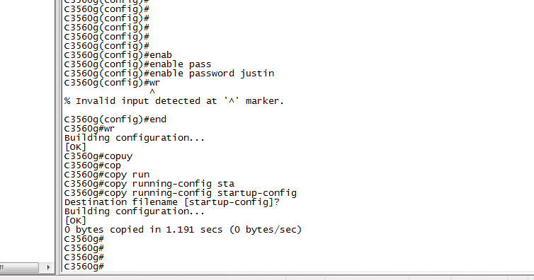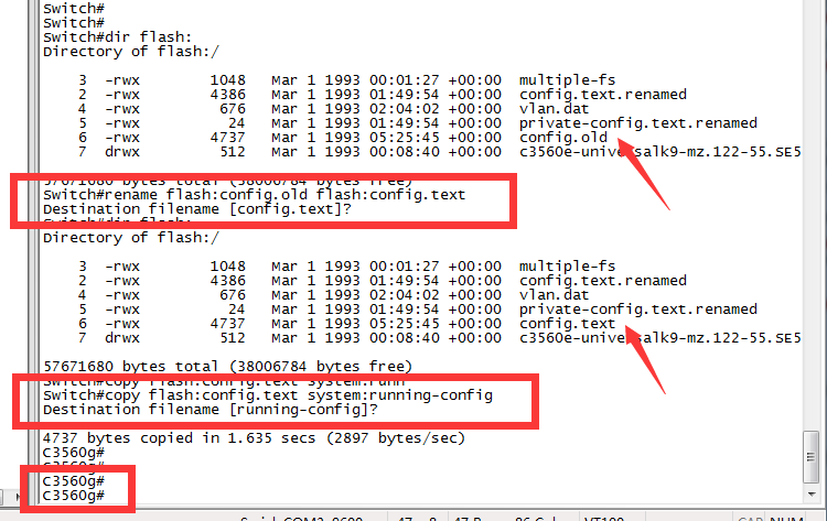 输入命令<copy flash:config.text system:running-config >,保存配置到交换机的DRAM存储器。,此时交换机恢复之前的配置。主机名变成了恢复前的c3560,输入命令<show run >,交换机恢复以前的配置信息。