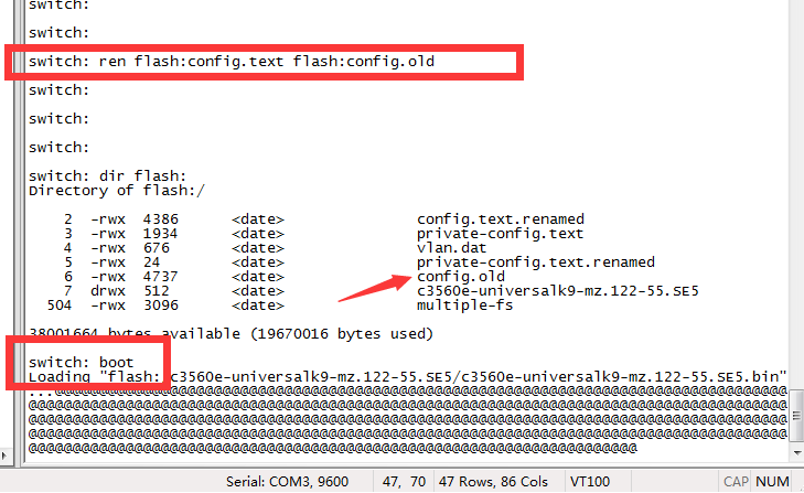 输入命令<rename flash:config.text flash:config.old>回车,重命名交换机原始配置文件。"config.old"是随便取得文件名。输入命令<dir flash:> 回车,查看文件名是否修改成功;成功后,输入命令<boot>,重启交换机。
