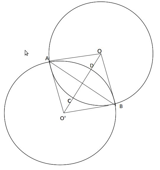 分析:如图,ACBD就是我们要求的面积,要想直接求显然是不可行的,我们可以把它拆成ACB和ADB两个楔形(是叫这个吧?),如果首先求ACB的话,只要求出扇形ACB和三角形OAB的面积相减就可以,而想求它们两个的面积就得求出角AOB的度数。怎么求呢,我们可以先用余弦定理求出角AOB的cos值,然后一个NB的东西就出场了(至少我这么想),cmath~,里面提供了反余弦函数,那我们就可以通过cos值直接得到角度。之后就随便搞一下就可以了。