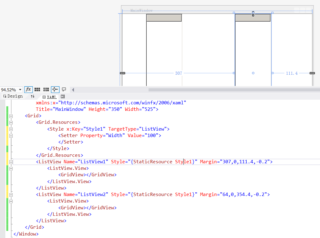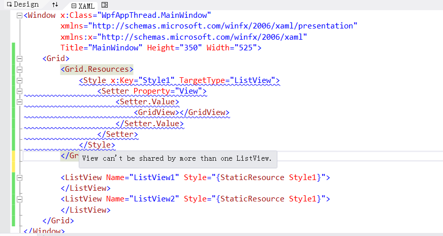 <Window x:Class="WpfAppThread.MainWindow" xmlns="http://schemas.microsoft.com/winfx/2006/xaml/presentation" xmlns:x="http://schemas.microsoft.com/winfx/2006/xaml" Title="MainWindow" Height="350" Width="525"> <Grid> <Grid.Resources> <Style x:Key="Style1" TargetType="ListView"> <Setter Property="View"> <Setter.Value> <GridView></GridView> </Setter.Value> </Setter> </Style> </Grid.Resources> <ListView Name="ListView1" Style="{StaticResource Style1}"> </ListView> <ListView Name="ListView2" Style="{StaticResource Style1}"> </ListView> </Grid> </Window>