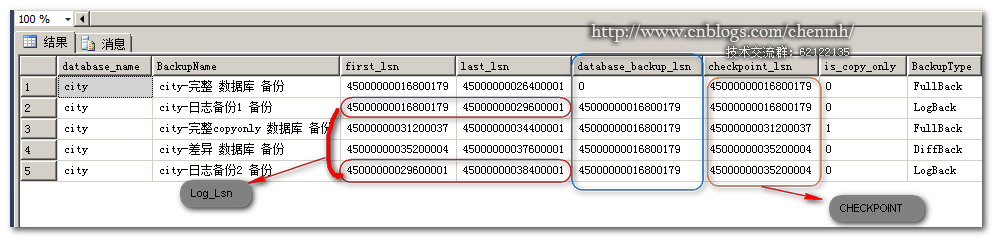 从中间的截框“database_backup_lsn”列可以看到,所有的后面的备份都基于第一次完整备份作为基准备份。