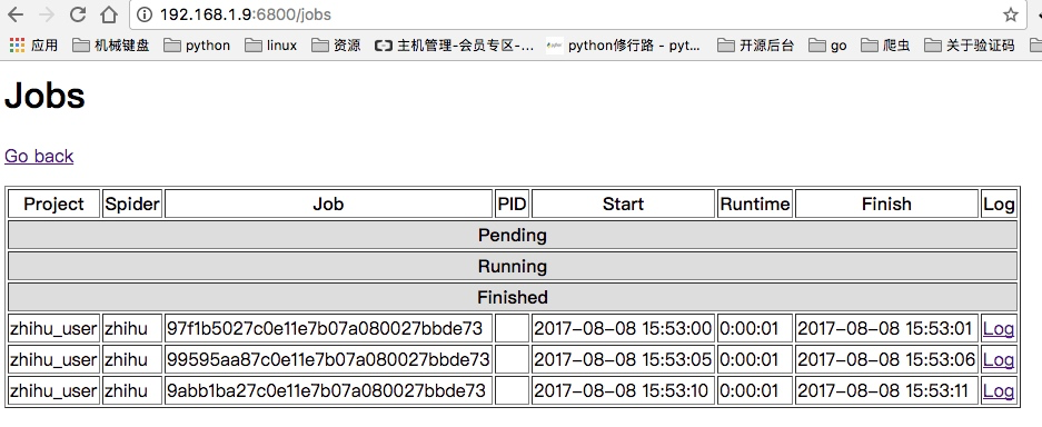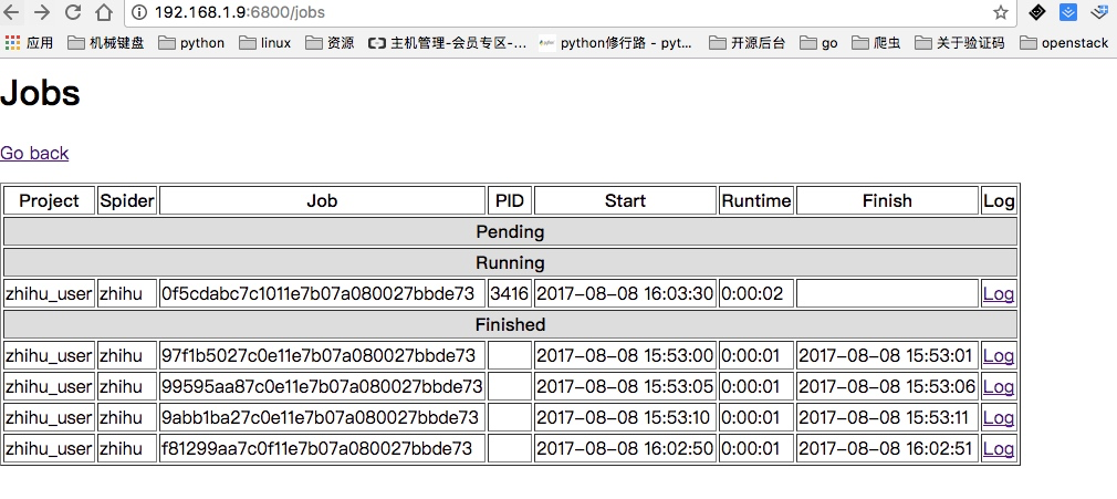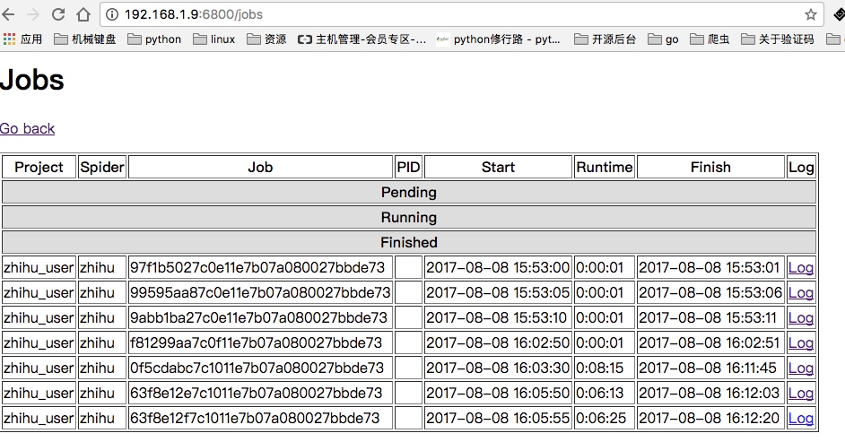 zhaofandeMBP:zhihu_user zhaofan$ curl http://192.168.1.9:6800/listjobs.json\?project\=zhihu_user {"node_name": "fan-VirtualBox", "status": "ok", "running": [], "pending": [], "finished": [{"start_time": "2017-08-08 15:53:00.510050", "spider": "zhihu", "id": "97f1b5027c0e11e7b07a080027bbde73", "end_time": "2017-08-08 15:53:01.416139"}, {"start_time": "2017-08-08 15:53:05.509337", "spider": "zhihu", "id": "99595aa87c0e11e7b07a080027bbde73", "end_time": "2017-08-08 15:53:06.627125"}, {"start_time": "2017-08-08 15:53:10.509978", "spider": "zhihu", "id": "9abb1ba27c0e11e7b07a080027bbde73", "end_time": "2017-08-08 15:53:11.542001"}]} zhaofandeMBP:zhihu_user zhaofan$