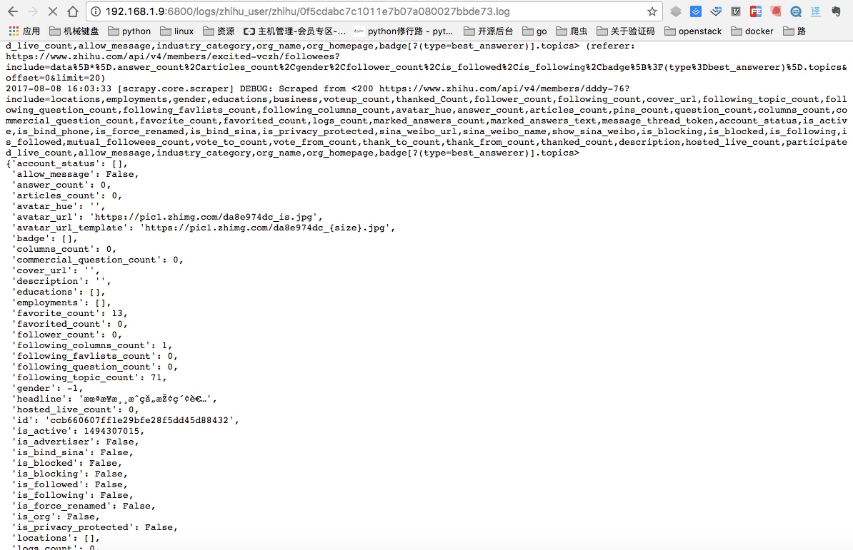 pip install scrapy_redis pymongo安装后重新启动,就可以看到已经在运行的任务,同时点开Log日志也能看到爬取到的内容:
