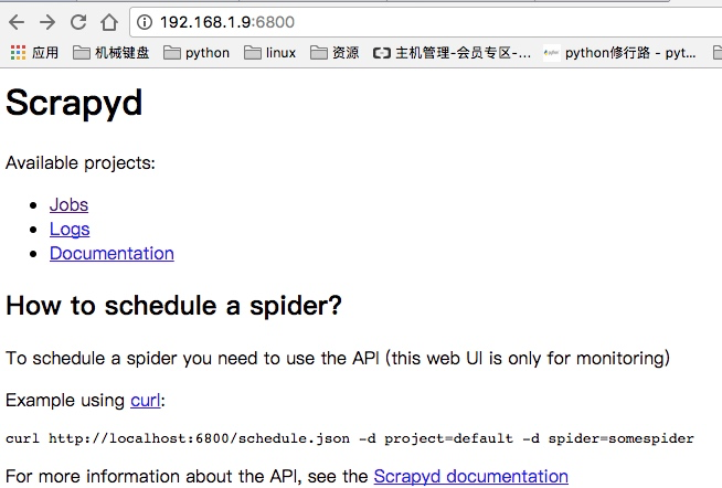 当在远程主机上安装了scrapyd并启动之后,就会再远程主机上启动一个web服务,默认是6800端口,这样我们就可以通过http请求的方式,通过接口的方式管理我们scrapy项目,这样就不需要在一个一个电脑连接拷贝过着通过git,关于scrapyd官方文档地址:http://scrapyd.readthedocs.io/en/stable/