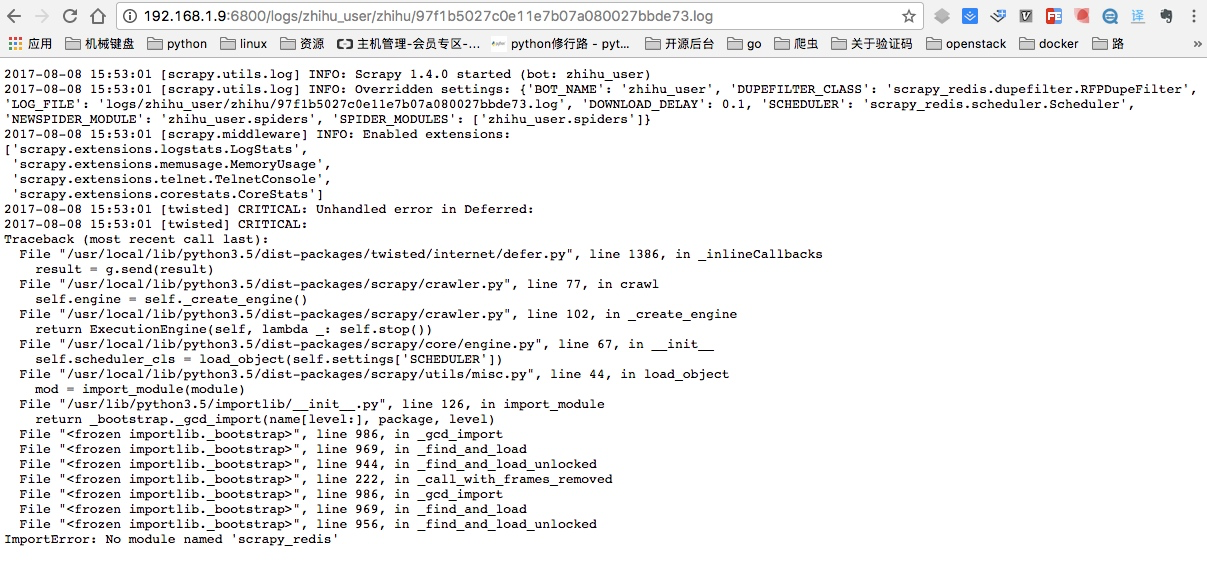 这里出错的原因就是我上面忘记在ubuntu虚拟机安装scrapy_redis以及pymongo模块,进行