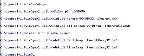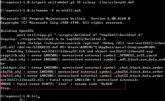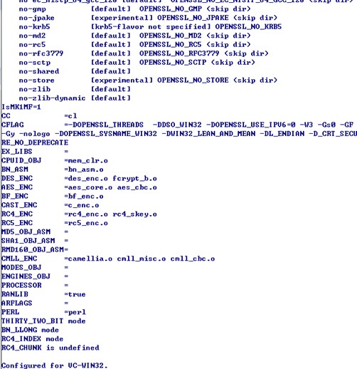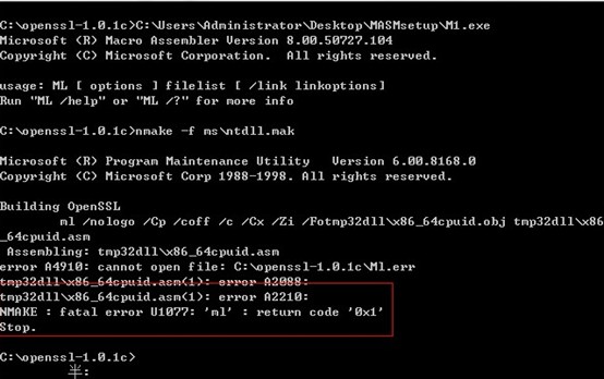 执行" perl Configure VC-WIN32 no-asm -DOPENSSL_USE_IPV6=0" no-asm表示没有用NASM编译,DOPENSSL_USE_IPV6=0 禁用IPV6,避免出现NMAKE : fatal error U1077: 'cl' :