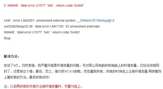 解决方法:nmake.exe的文件,这个文件应该位于C:\Program Files\Microsoft Visual Studio\VC98\Bin目录中,配置环境变量即可。操作:右键单击我的电脑-->属性-->高级-->环境变量--系统变量 (找到path)-->编辑,将C:\Program Files\Microsoft Visual Studio\VC98\Bin加到未尾(注意要和前一个路径用";"隔开,并以";"结束;最后要提醒一点,一定要重启机器,新的path才会生效;