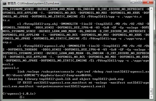6、然后回到C:\openssl-1.0.1c 执行nmake -f ms\ntdll.mak; 看到下图,你就可以高兴了。安装成功。