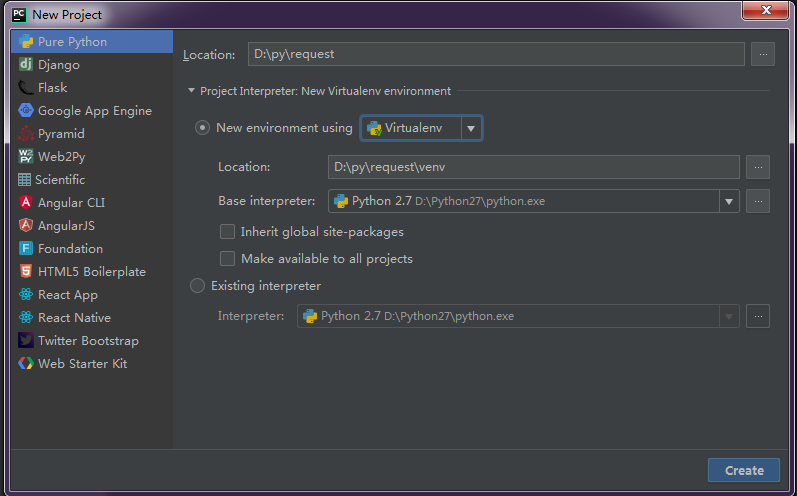 创建new project时选择创建新的环境,修改你们自己的目录,如果主机内有多个版本的python解释器可自行选择
