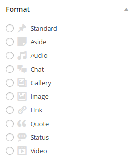 下面是wordpress支持的9种post format类型,如果主题支持这些类型,发布文章时就可以选择它们。
