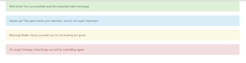 <!DOCTYPE html> <html lang="zh-CN"> <head> <meta charset="utf-8"> <meta http-equiv="X-UA-Compatible" content="IE=edge"> <meta name="viewport" content="width=device-width, initial-scale=1"> <!-- 上述3个meta标签*必须*放在最前面,任何其他内容都*必须*跟随其后! --> <title>Bootstrap 101 Template</title> <!-- Bootstrap --> <link rel="stylesheet" href="https://cdn.bootcss.com/bootstrap/3.3.7/css/bootstrap.min.css" integrity="sha384-BVYiiSIFeK1dGmJRAkycuHAHRg32OmUcww7on3RYdg4Va+PmSTsz/K68vbdEjh4u" crossorigin="anonymous"> <!-- HTML5 shim and Respond.js for IE8 support of HTML5 elements and media queries --> <!-- WARNING: Respond.js doesn't work if you view the page via file:// --> <!--[if lt IE 9]> <script src="https://cdn.bootcss.com/html5shiv/3.7.3/html5shiv.min.js"></script> <script src="https://cdn.bootcss.com/respond.js/1.4.2/respond.min.js"></script> <![endif]--> </head> <body> <div class="container"> <div class="alert alert-success" role="alert">Well done! You successfully read this important alert message.</div> <div class="alert alert-info" role="alert">Heads up! This alert needs your attention, but it's not super important.</div> <div class="alert alert-warning" role="alert">Warning! Better check yourself, you're not looking too good.</div> <div class="alert alert-danger" role="alert">Oh snap! Change a few things up and try submitting again.</div> </div> <!-- jQuery (necessary for Bootstrap's JavaScript plugins) --> <script src="https://cdn.bootcss.com/jquery/1.12.4/jquery.min.js"></script> <!-- Include all compiled plugins (below), or include individual files as needed --> <script src="https://cdn.bootcss.com/bootstrap/3.3.7/js/bootstrap.min.js" integrity="sha384-Tc5IQib027qvyjSMfHjOMaLkfuWVxZxUPnCJA7l2mCWNIpG9mGCD8wGNIcPD7Txa" crossorigin="anonymous"></script> </body> </html>