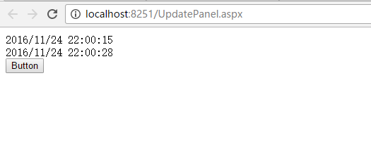 其实没什么特别的,点击按钮,会发现 UpdatePanel1 控件中的 Label1 显示的时间会刷新,但 UpdatePanel1 控件外的 Label2 控件显示的时间是最初加载显示的时间,结果如下: