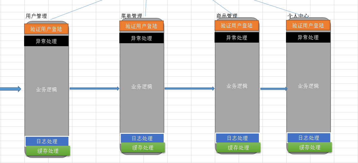 我们在开发系统模块的时候,比如:用户管理模块,菜单模块,商品模块,个人中心模块,这些模块都需要有‘验证用户登录功能’,‘异常处理功能’,'日志处理功能','缓存处理功能',那么怎么在不改变这些模块本身业务情况下,把这些通用功能横切的加入到每个模块中呢?那么就需要AOP思想了