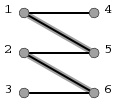 (3)找到增广路径3->6->2->5->1->4,把它取反,则匹配数增加到3。