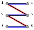 (7)最后,也是最重要的一条,把增广路径上的所有第奇数条边加入到原匹配中去,并把增广路径中的所有第偶数条边从原匹配中删除(这个操作称为增广路径的取反),则新的匹配数就比原匹配数增加了1个。(如图2所示,新的匹配就是所有蓝色的边,而所有红色的边则从原匹配中删除。则新的匹配数为3。)