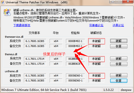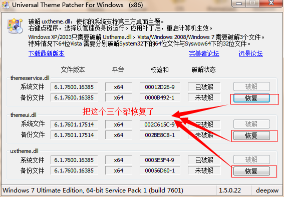最后无解,去请教[度娘],发现有个度也遇见过这个问题,据说是的跟windows系统的[主题文件被破解]的原因,当时我也想这呀的怎么就扯上关系了呢...本着不是我自己电脑的,玩坏了别人赔的原则,下载度友提供的[主题破解及还原工具],试试了,丫的还真解决了这个问题.于是乎就有了这篇废话,有需要的妹纸请继续往下看