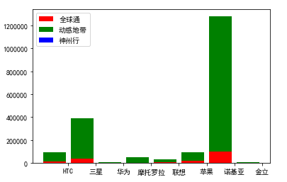 1 # -*- coding: utf-8 -*- 2 import numpy; 3 import matplotlib; 4 from pandas import read_csv; 5 from matplotlib import pyplot as plt; 6 7 font = { 8 'family' : 'SimHei' 9 }; 10 matplotlib.rc('font', **font); 11 12 data = read_csv('D:\\PA\\5.4\\data.csv'); 13 14 d1 = '手机品牌'; 15 d2 = '通信品牌'; 16 v = "月消费"; 17 18 gb = data.groupby(by=[d1, d2])['月消费(元)'].agg({v: numpy.sum}); 19 20 d1size = gb.index.levels[0].size; 21 d2size = gb.index.levels[1].size; 22 23 index = numpy.arange(d1size); 24 colors = ['r', 'g', 'b']; 25 bsum = index*0.0; 26 27 for i in range(0, d2size): 28 print(i); 29 subgb = gb[v][gb.index.labels[1]==i]; 30 bar = plt.bar(index, subgb, color=colors[i], bottom=bsum); 31 bsum += subgb; 32 33 plt.xticks(index+1/2, gb.index.levels[0]); 34 35 plt.legend(gb.index.levels[1]); 36 plt.show();