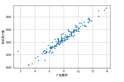 #plt.plot(data['广告费用'], data['购买用户数'], 'o')