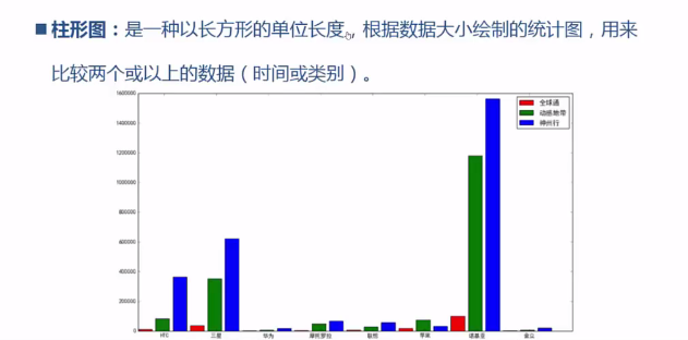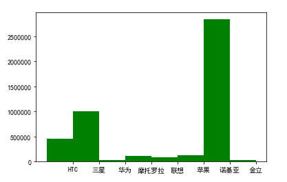 1 # -*- coding: utf-8 -*- 2 import numpy; 3 import matplotlib; 4 from pandas import read_csv; 5 from matplotlib import pyplot as plt; 6 7 font = { 8 'family' : 'SimHei' 9 }; 10 matplotlib.rc('font', **font); 11 12 data = read_csv('D:\\PA\\5.4\\data.csv'); 13 14 gb = data.groupby( 15 by=['手机品牌'] 16 )['月消费(元)'].agg({ 17 '月消费': numpy.sum 18 }); 19 20 index = numpy.arange(gb['月消费'].size); 21 22 #竖向柱形图 23 plt.bar(index, gb['月消费'], 1, color='G'); 24 plt.show(); 25 26 plt.bar(index, gb['月消费'], 1, color='G'); 27 plt.xticks(index + 1/2, gb.index); 28 plt.show(); 29 30 #横向柱形图 31 plt.barh(index, gb['月消费'], 1, color='G'); 32 plt.yticks(index + 1/2, gb.index); 33 plt.show();