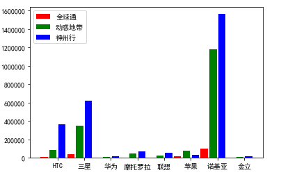 1 # -*- coding: utf-8 -*- 2 import numpy; 3 import matplotlib; 4 from pandas import read_csv; 5 from matplotlib import pyplot as plt; 6 7 font = { 8 'family' : 'SimHei' 9 }; 10 matplotlib.rc('font', **font); 11 12 data = read_csv('D:\\PA\\5.4\\data.csv'); 13 14 d1 = '手机品牌'; 15 d2 = '通信品牌'; 16 v = "月消费"; 17 18 gb = data.groupby(by=[d1, d2])['月消费(元)'].agg({v: numpy.sum}); 19 20 d1size = gb.index.levels[0].size; 21 d2size = gb.index.levels[1].size; 22 23 index = numpy.arange(d1size); 24 colors=['r', 'g', 'b']; 25 26 for i in range(0, d2size): 27 print(i); 28 subgb = gb[v][gb.index.labels[1]==i]; 29 bar = plt.bar(index*d2size + i, subgb, color=colors[i]); 30 31 lIndex = numpy.arange(d1size)*d2size; 32 plt.xticks(lIndex + 3/2, gb.index.levels[0]); 33 34 plt.legend(gb.index.levels[1]); 35 plt.show();