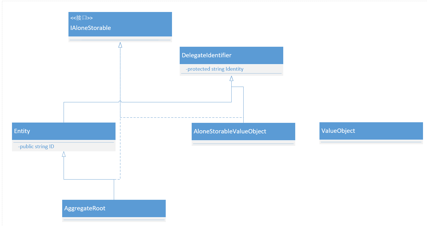 其中需要注意的是Entity中的ID其实就是对DelegateIdentifier.Identity的引用,也就是仅仅为了做一个Public的公开。另外AloneStorableValueObject与ValueObject唯一不同是其需要持久化并独占一个数据表,而ValueObject是不需要持久化或者跟着所属的聚合根持久化的。然后我们的IRepository<T>变成下面这样约束: