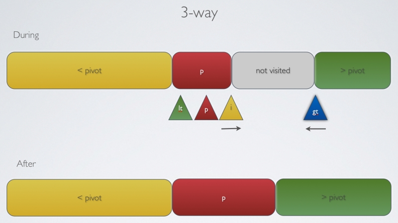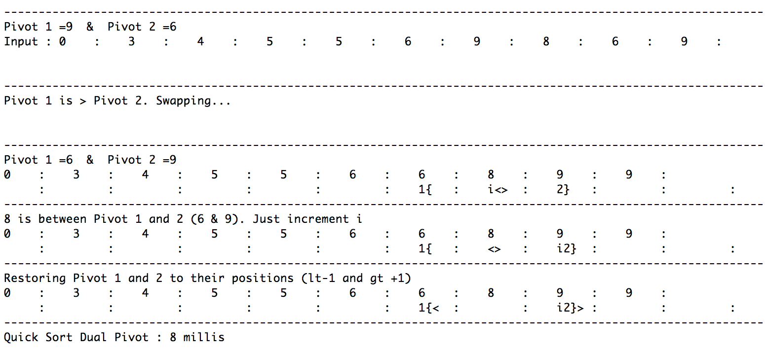 我一直觉得算法跟踪很有趣,但是双基准快速排序中出现的变量个数让我眼花缭乱。所以,接下来我在(三种)实现中都加入了调试信息,这样就可以看出实际运行中不同。