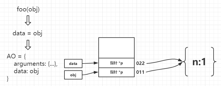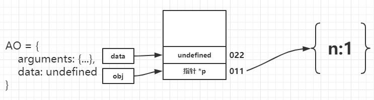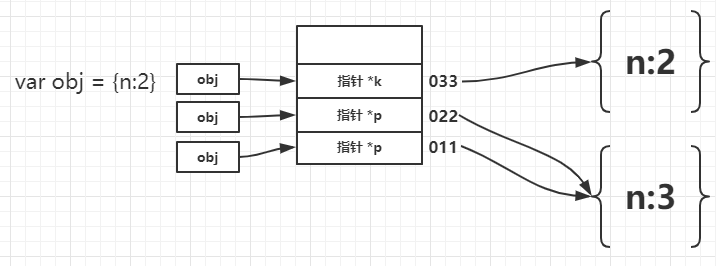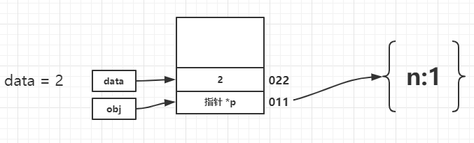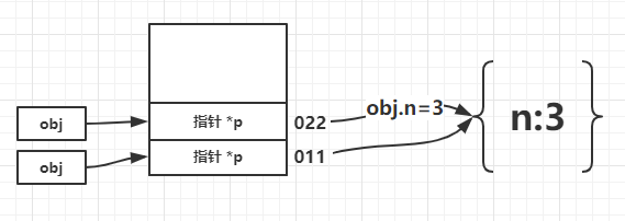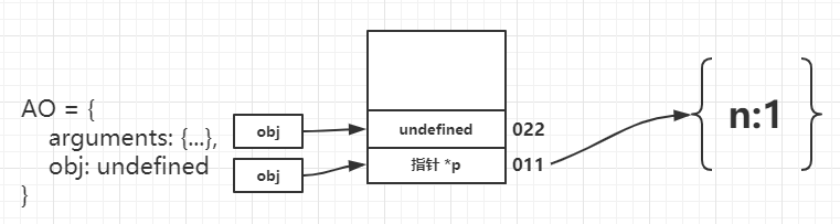 声明变量obj,地址为011其中存入指向{n:1}的指针*p
